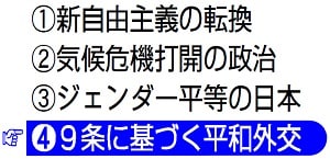 日本共産党は「憲法9条を生かした平和外交」へのチェンジで、憲法を破壊し、米国とともに「海外で戦争する国」づくりを進めてきた安倍・菅政治を転換しようと訴えています。中でも、(1)核兵器禁止条約に参加する政府をつくる(2)沖縄県名護市辺野古の米軍新基地建設を中止する―ことが総選挙の重大争点になっています。(石橋さくら、斎藤和紀)