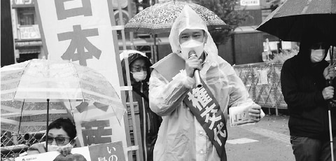 ![]() (写真)訴える宮本氏(中央)=17日、東京都東村山市 |