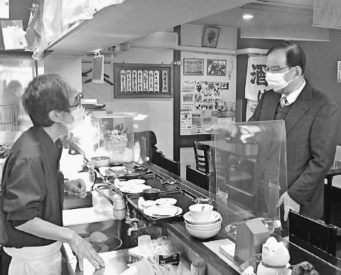 ![]() (写真)飲食店の店主(左)と懇談する志位和夫委員長=20日、札幌市中央区 |