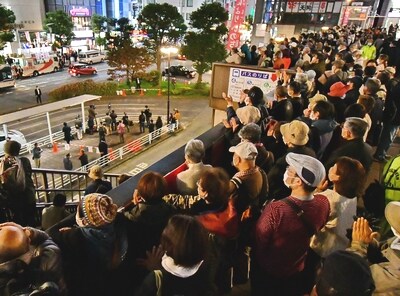 志位氏は夕方には千葉県の津田沼駅前に駆け付け、南関東比例候補の、はたの君枝(神奈川10区重複)、さいとう和子、沼上とくみつ、寺尾さとし(千葉2区重複)の各氏らと訴えました。仕事帰りの人々が次々と足を止めデッキから盛んな拍手が湧き起こりました。