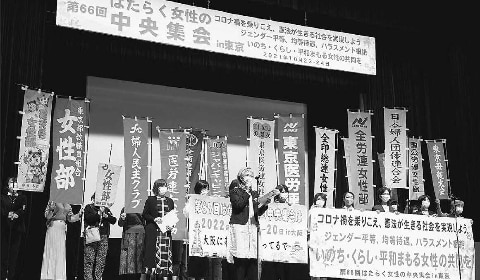 第66回はたらく女性の中央集会が23、24両日、東京都内の会場とオンライン併用で開かれました。コロナ禍を乗り越え、ジェンダー平等、均等待遇、ハラスメント根絶で憲法が生きる社会の実現を呼びかけました。