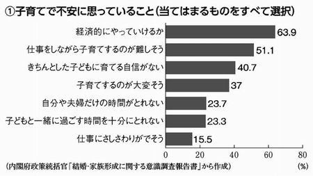 子育てで不安に思うことは「経済的にやっていけるか」。20~39歳の男女7000人に尋ねたところ、63・9%もの人がこう答えました。(グラフ①)