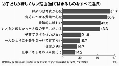 回答数の上位3位は経済面に関する理由でした。「将来の教育費が心配」54・7%、「育児にかかる費用が心配」50・9%、「経済的に難しい」43・8%です。(グラフ②)