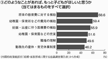回答数の上位3位は「将来の教育費への補助」68・6%、「幼稚園・保育所などの費用の補助」59・4%、「妊娠・出産に伴う医療費の補助」55・9%となりました(グラフ③)。政府の責任で妊娠・出産・保育・教育の負担を減らすことがいかに重要か、一目瞭然です。