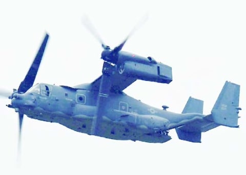 ![]() (写真)横田基地を離陸するCV22オスプレイ=10月27日(羽村平和委員会提供) |