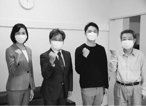 ![]() (写真)党事務所を訪れた金子氏(左端)と応対した町田氏(その右)ら=1日、福島市 |