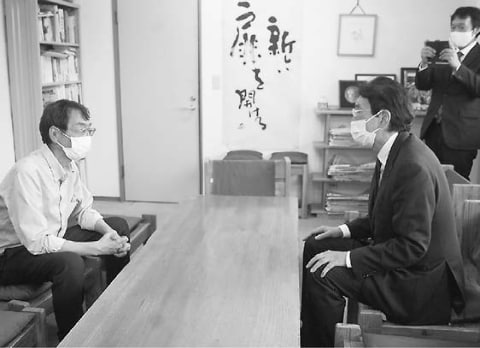 ![]() (写真)懇談する(左から)鮎沢、下条の両氏=1日、長野市 |