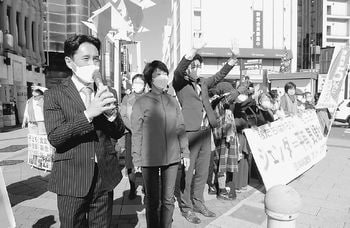 ![]() (写真)総選挙結果を報告する(左から)藤野、長瀬、武田の各氏ら=6日、長野駅前 |