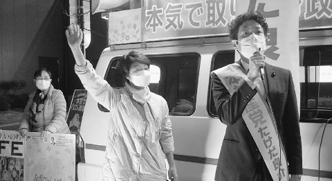 ![]() (写真)街頭で訴える(右から)武田氏、長瀬氏、廻本多都子市議=19日、長野県諏訪市 |
