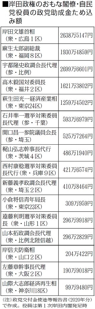 岸田内閣の閣僚や自民党役員が支部長を務める自民党支部の「政党交付金使途等報告書」(2020年分、総務省が9月24日に公表)を調べたもの。(表参照)