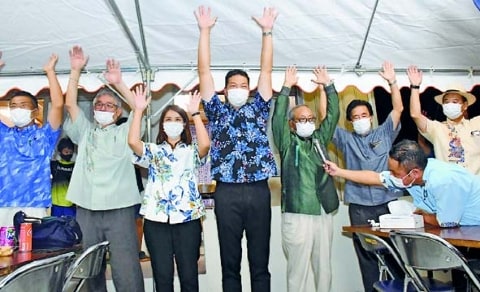 ![]() (写真)「当選」の報告を受けバンザイをする渡久地氏(中央)と(後列右から)高良、伊波の両参院議員、野国町長、瑞慶覧県議(左から2人目)ら=21日、沖縄県北谷町 |