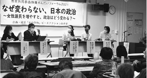 「女性議員を増やそう」と呼びかける集会が21日、仙台市で開かれました。「女の平和」ピースアクションみやぎと宮城女性九条の会が企画・運営する集会に、70人の市民が参加しました。