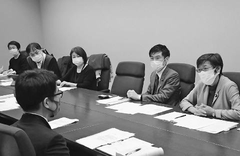 ![]() (写真)入管庁と厚労省の話を聞く、右から倉林、山添、山本、久保田の各氏=24日、国会内 |