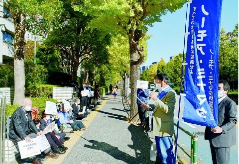 ![]() (写真)環境省前で宣伝する原告団・弁護団と支援者ら=25日、東京都千代田区 |