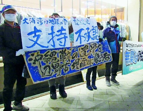 ホワイトイルミネーションが輝く札幌市繁華街。白い息を弾ませて、青のグッズを身に着けた市民らが駆け付け、「沖縄戦犠牲者の遺骨が眠る土砂を辺野古埋め立てに使うな」「大浦湾は地球の宝 不承認支持」と手作りの横断幕を掲げてアピール。市民の注目が集まりました。