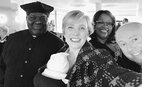 ![]() (写真)生後間もなくの赤ちゃんを連れて地元で活動するステラ・クリーシー英下院議員(中央)=10月(本人のツイッターから) |