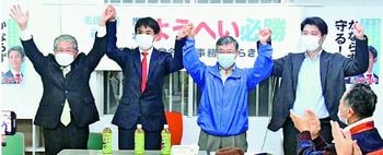 ![]() (写真)名護市長選必勝へ団結を深める(左から)赤嶺衆院議員、岸本氏、稲嶺前市長ら=2日、沖縄県名護市 |