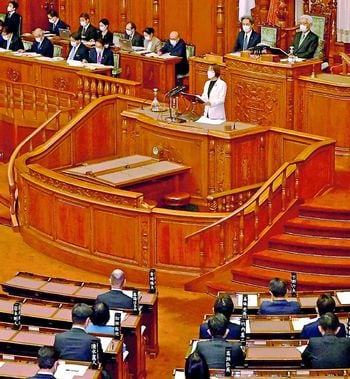 ![]() (写真)代表質問で政府を追及する田村智子副委員長=10日、参院本会議 |