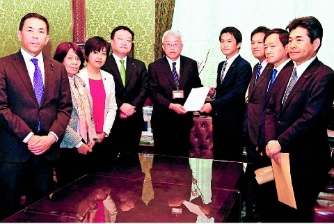 ![]() (写真)PCR検査強化法案を共同提出する野党議員ら。右から3人目は日本共産党の宮本徹衆院議員=2020年3月3日、国会内 |