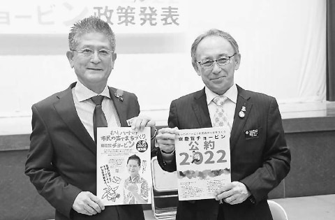 来月16日告示・同23日投票の沖縄県南城市長選で再選を目指す「オール沖縄」の瑞慶覧(ずけらん)チョービン市長は20日、同市内での記者会見で、政策を発表しました。「市民の声でまちづくり」「誰ひとり取り残さない」姿勢を貫き、SDGs(持続可能な開発目標)の推進、平和を求め発展する南城市を築くことなどを公約しました。