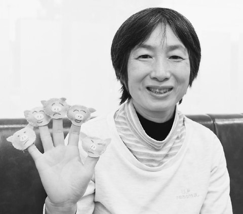 ![]() (写真)手作りの指人形を見せる小林君江さん |
