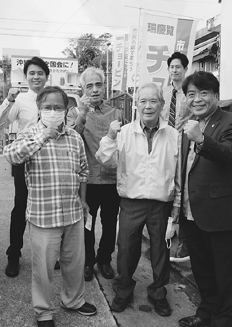 ![]() (写真)必ず勝利しようと激励する、にひ氏(右端)と(左へ)比嘉、松田、大島の各氏=24日、沖縄県南城市 |