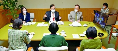 ![]() (写真)気候アクティビストたちと懇談する(奥左から)吉良よし子参院議員、志位和夫委員長、笠井亮衆院議員=27日、党本部 |