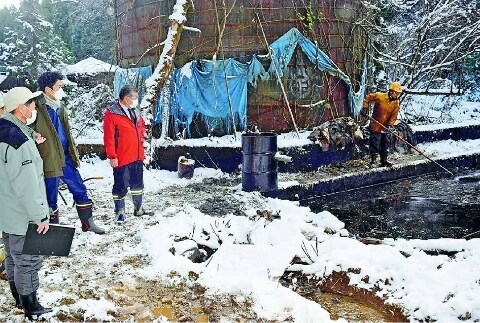 たけだ氏らは、湧き出た原油が流れ着く貯水槽から手作業でくみ取りを続ける現場などを視察。市職員から「このままでは年間7千万円以上の処理費用が見込まれ、負担しきれない」と国の支援への要望があり、たけだ氏は「国は採掘業者に鉱業権を与えた責任があり、後処理も国の責任で支援するよう働きかけていく」と答えました。