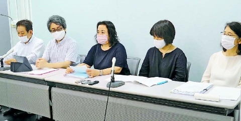 ![]() (写真)会見する労働組合「ヤマハ英語講師ユニオン」の清水委員長(中央)、奥田二三世副委員長(その右)と弁護士、支援者=7月7日、大阪市北区 |