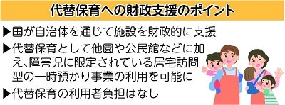 厚労省は今回、災害時と同様の特例措置として、代替保育の補助単価を通常の保育と同等の単価まで引き上げ自治体を財政的に支援します。通常は発生する利用者負担についても、財政支援で負担がないようにするといいます。障害のある子どもに限定されている居宅訪問型の一時預かり事業も、障害の有無にかかわらず利用を可能としました。