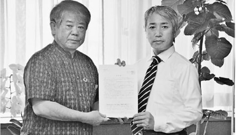 ![]() (写真)照屋副知事(左)に要請書を手渡す県労連の穴井議長=29日、沖縄県庁 |