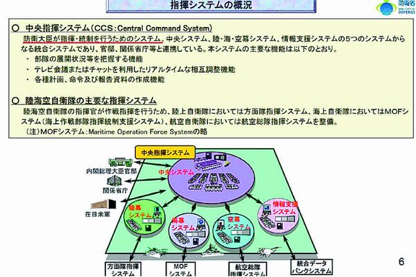 ![]() 穀田議員が27日の衆院外務委員会で配布した防衛省資料(同日現在、首相官邸ホームページから削除)。概念図左側に、自衛隊の中央指揮システムと首相官邸、関係省庁、在日米軍が連接していることを示している(点線内) |