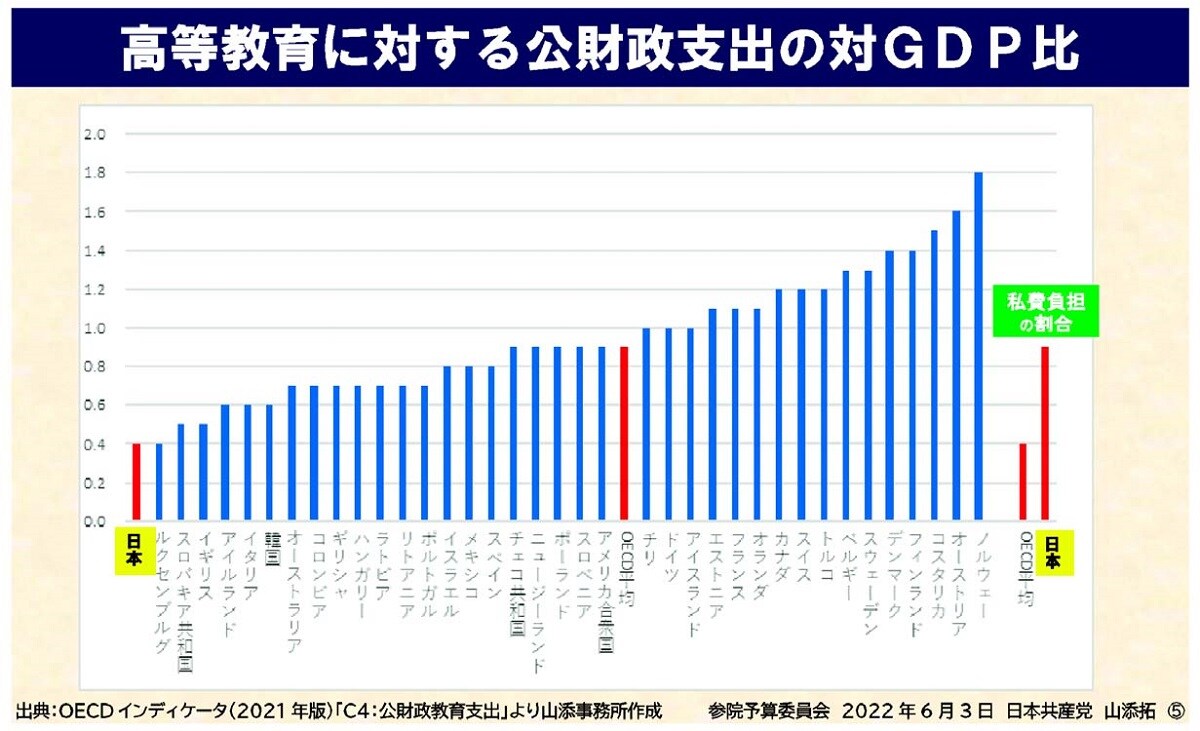 さらに山添氏は、政府は2012年、高等教育を次第に無償とすると定めた国際人権A規約の留保を撤回したため、学費を下げる必要があるにもかかわらず、国立大の学費は下がらず、私大は値上げしたと強調。「原因ははっきりしている」と述べ、日本の高等教育の予算はGDP比でわずか0・4%、経済協力開発機構(OECD)38カ国平均の半分しかなく、私費負担は0・9%で、OECD平均の倍だと批判しました。