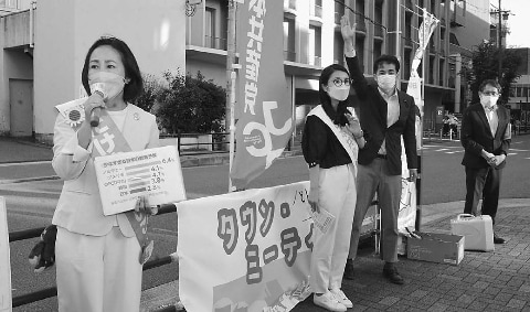 ![]() (写真)街頭から訴える(左から)たけやま、堀川の両氏ら=12日、京都市南区 |