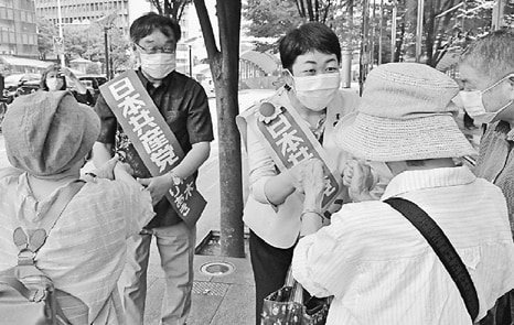 日本維新の会が大嫌いで「消費税減税と原発ゼロが必要。共産党か『れいわ』かで迷っている」と話す40代の男性には、「赤旗」号外と「はてな」リーフを渡し「読んでよく考えてください」と訴えました。