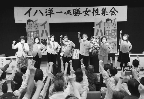 ![]() (写真)勝利に向けて頑張ろうと決意を固めるイハ候補(壇上左から4人目)と女性集会参加者=26日、那覇市 |