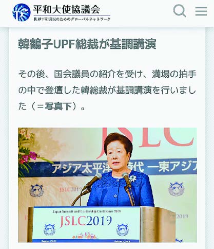 細田氏が出席したのは、旧統一協会系の天宙平和連合(UPF)が同年10月5日に名古屋市内のホテルで開いた国際会議「ジャパンサミット&リーダーシップカンファレンス2019」。UPFは統一協会の開祖・文鮮明(12年に死去)と妻の韓鶴子が創設した団体です。