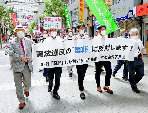 安倍晋三元首相の「国葬」に反対する熊本県の昼休み市民集会(実行委員会主催)が29日、熊本市のアーケード街で開かれました。120人が国葬反対の横断幕やプラカードを掲げ行進しました。
