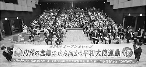 ![]() (写真)藤井富山市長らが来賓で出席した2021年5月30日の「オープンカレッジ」の写真=平和大使協議会のホームページから(現在は削除) |