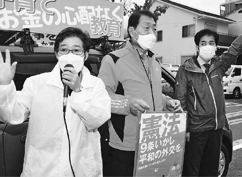 ![]() (写真)街頭で訴える(左から)倉林、赤阪、西山の各氏=20日、京都市伏見区 |