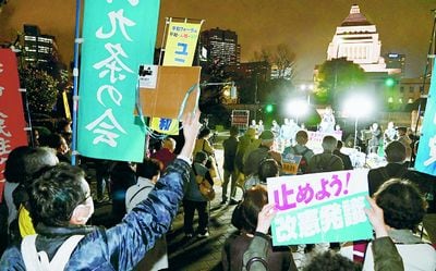 ![]() (写真)「大軍拡やめよ」「憲法を守れ」とアピールする人たち=24日、国会正門前 |