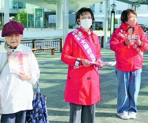 吹田市のJR岸辺駅前では30日、石川府議とともに塩見みゆき、玉井みき子両市議、地元後援会の人たちが「カジノより命、暮らし、中小企業応援の府政へ、知事には、たつみコータロー、府議には石川たえを」とビラを配って早朝宣伝。石川府議は激励の声をかける人に「厳しい選挙です。一人でも二人でも広げてください」と支援を呼びかけ、「困っている人の声、声にならない声をしっかり受け止めて届ける日本共産党の議席を守り抜くために頑張り抜きます」と決意を語りました。