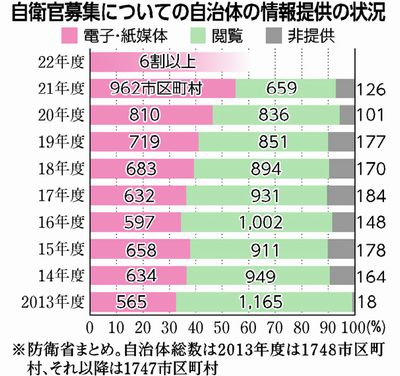 防衛省は22年度について集計中で正確な数字は答えられないとしつつ、電子・紙媒体が「6割を超える」と説明。具体的な自治体名の公表は「当該地方公共団体との信頼が損なわれ、今後の募集事務の適正な遂行に支障を及ぼすおそれがある」と拒否しました。