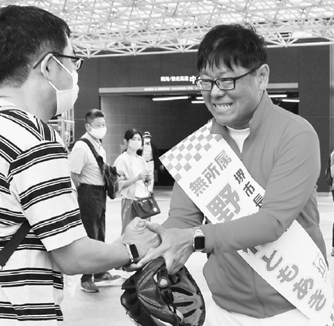 ![]() (写真)街頭演説の後、聴衆と握手する野村候補(右)=28日、堺市北区 |