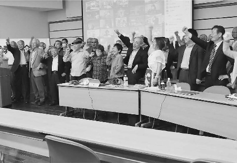 ![]() (写真)「農政の転換へ地域に根ざした強く大きな農民連を」と決意を固めあう代表者会議の参加者=5日、東京都内 |