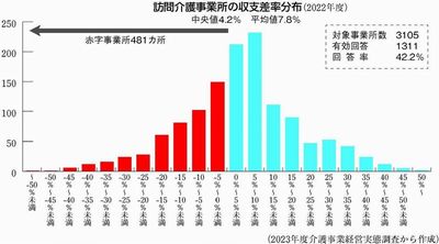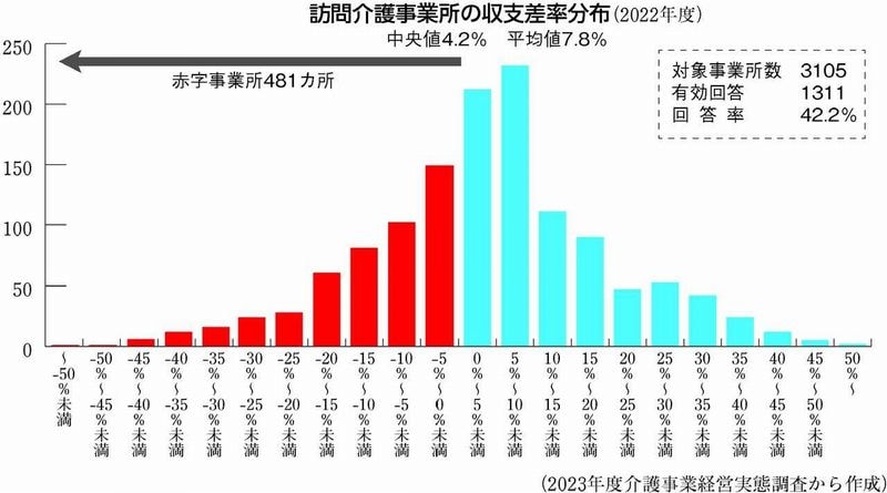 ところが本紙が厚労省から入手した同調査結果資料によると、収支差率が「0%未満」の訪問介護事業所が36・7%(481事業所)を占めることが分かりました。日本共産党の宮本徹衆院議員が2月6日の衆院予算委員会で指摘していた詳細が判明したもの。この比率からすると、約3万4400カ所(2022年4月)の訪問介護事業所のうち赤字は1万2600カ所以上に上ります。