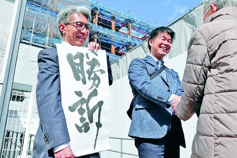 ![]() (写真)判決言い渡し後、地裁前で「勝訴」の旗が掲げられ、原告(右端)と握手して喜ぶ芦葉甫弁護士=21日、三重県津市 |