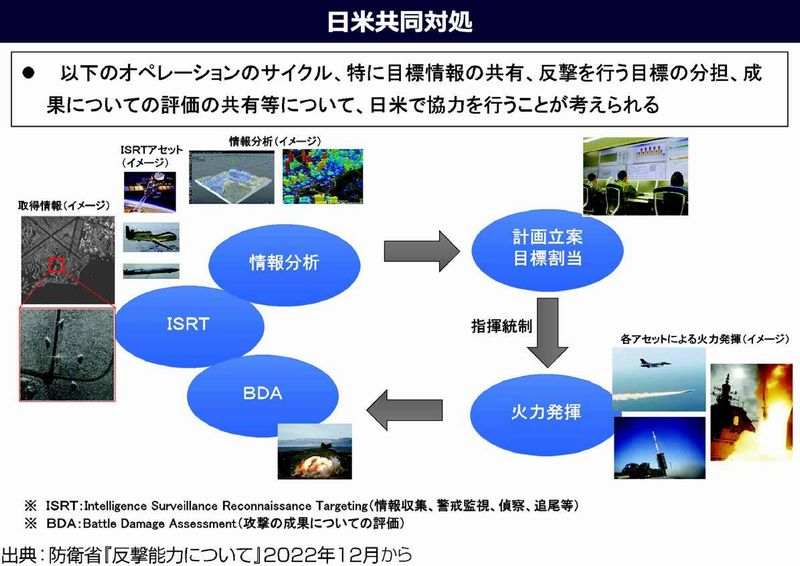 志位氏は、2022年12月に防衛省が作成した敵基地攻撃における「日米共同対処」の「オペレーションサイクル」の図解を示し(上図)、「目標情報の共有、反撃を行う目標の分担、成果についての評価の共有等について、日米で協力を行う」と明記していると指摘。重要なことは同文書が「指揮統制」と明記し、「米軍と自衛隊が指揮統制でも緊密な協力を行うことを明示されていることだ」と強調し、「指揮統制は情報でも、装備でも、圧倒的に優越的な立場にある米軍主導で行われ、自衛隊は事実上、米軍の指揮統制のもとに置かれることは明らかではないか」と迫りました。