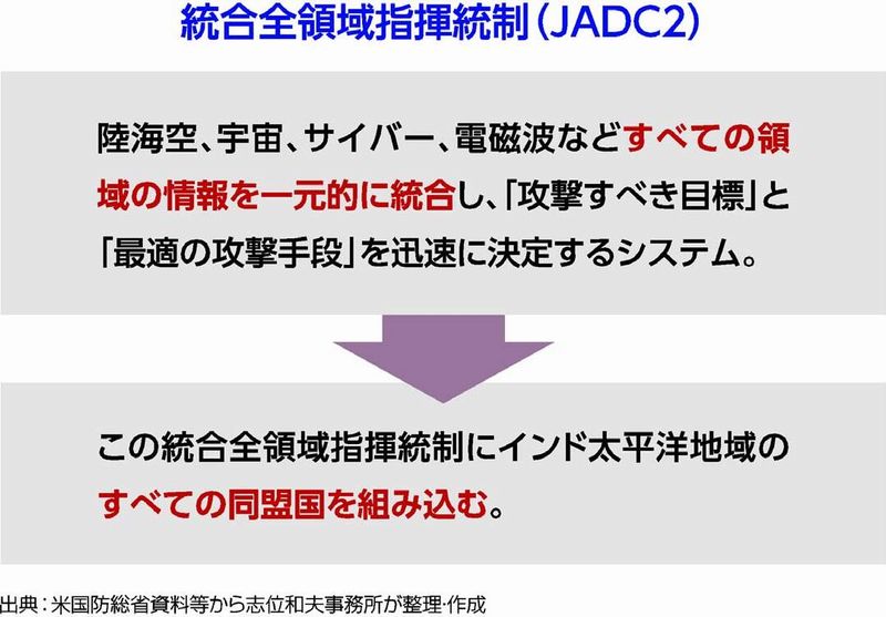 これに対して志位氏は、解説論文が、広大なインド太平洋地域では全ての同盟国を米国防総省が進めている「統合全領域指揮統制(JADC2)」に組み込む方針を示していると指摘。JADC2は陸海空、宇宙、サイバー、電磁波など全ての領域の情報を一元的に統合し、人工知能(AI)などを活用し「攻撃すべき目標」と「最適の攻撃手段」を迅速に決定する指揮統制システムだとされています。米国のIAMDの方針は、このシステムにすべての同盟国を組み込む方針を示しています。
