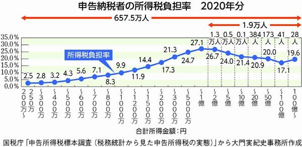 「1億円の壁」とは、株式譲渡益や配当にかかる所得税・住民税率が20%にとどまる一方、給与所得などにかかる所得税・住民税率は最高55%になるため、株式からの収入が多い高額所得者ほど税負担割合が低くなる現象です。
